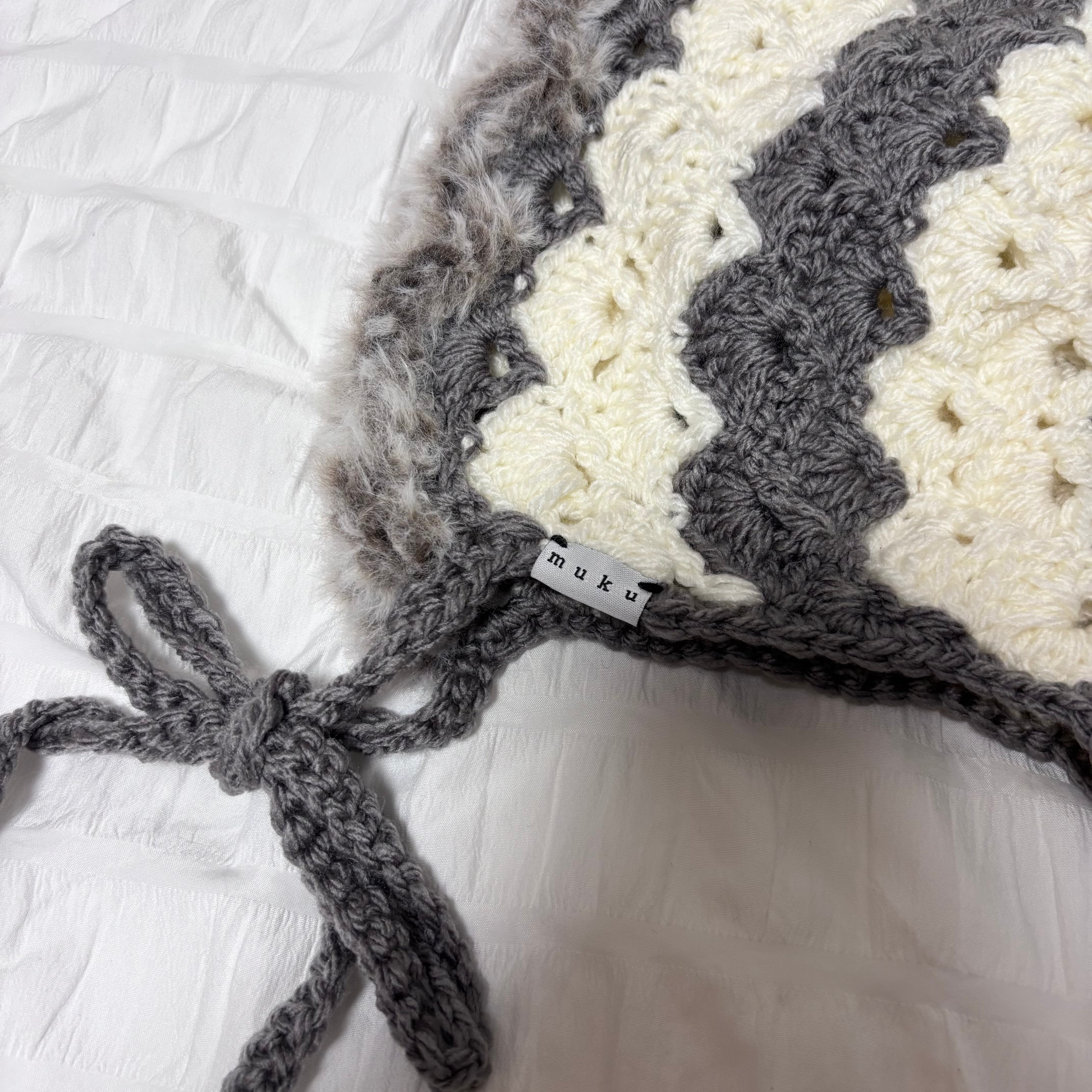 縁部分はふわふわの糸で編んでいるので、秋冬メインで着用していただけます☁️